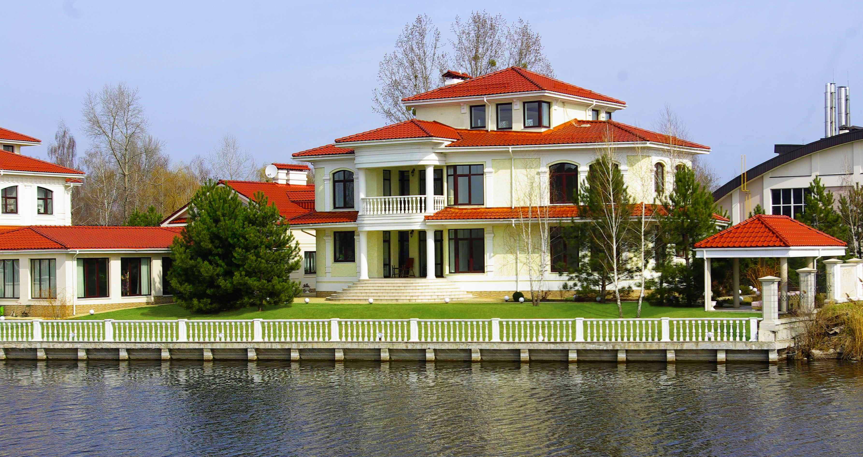 Рядом с домом находится домик для гостей (169,4 кв.м.) с бассейном 10м х 3,5м и сауной. Первая линия, участок 18 соток с выходом к реке Козинка, причал, возможно увеличение участка до 40 соток.